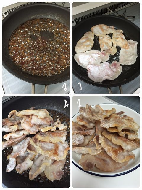 2)フライパンにやや多めの油を入れて強火にかけ、1の肉を広げて1枚ずつ入れる。片面がしっかり焦げ色が付くまで焼いたら裏返し、裏面も同じようにカリッと焼き付ける。焼けたのから取り出し、全部を焼く。