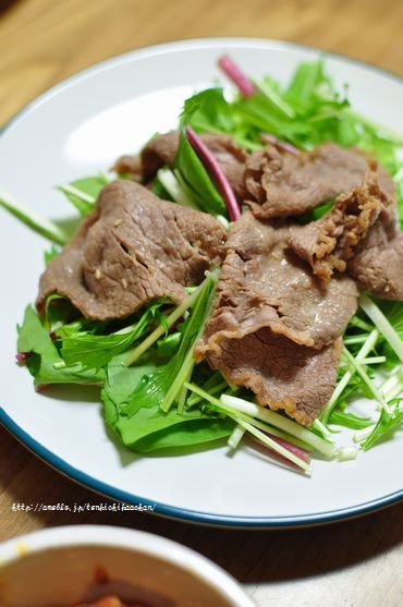 軽くしゃぶしゃぶした牛肉にわさび醤油を絡めてさまし、それを水菜と茎の赤いほうれん草(?)に乗っけただけ。