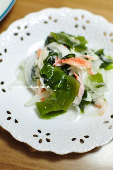 新玉ねぎをスライスし、わかめとカニカマと合わせて酢の物に。
