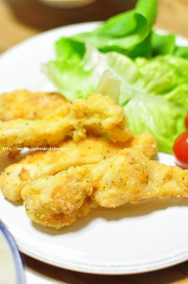 1)胸肉は皮を外し、繊維に垂直になるようにスティック状に切ってボウルに入れ塩をもみ込む。ここに玉子と片栗粉を入れて混ぜて20分ほどおいておく。