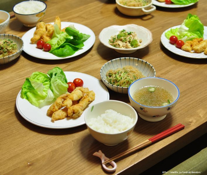 「母ちゃんちの晩御飯とどたばた日記」の井上かなえ(かな姐)です。朝は片栗粉をまぶしてさっと揚げるだけ。鰹節と青のり味の2種類を作ります。お弁当にもピッタリの冷めてもおいしい春らしいお野菜の唐揚げです。