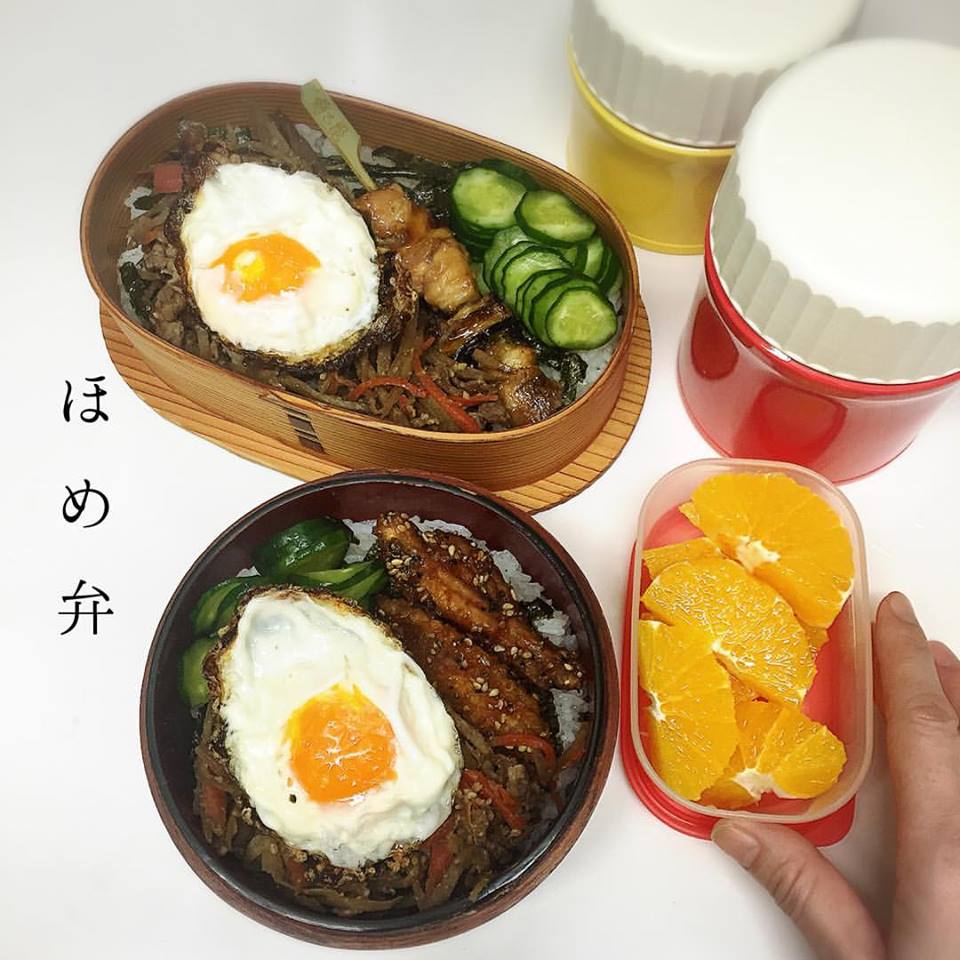 〇きんぴら丼(牛肉たっぷりのきんぴらごぼう、胡瓜の塩もみ、カリカリ目玉焼き、もみ海苔、ごはん)