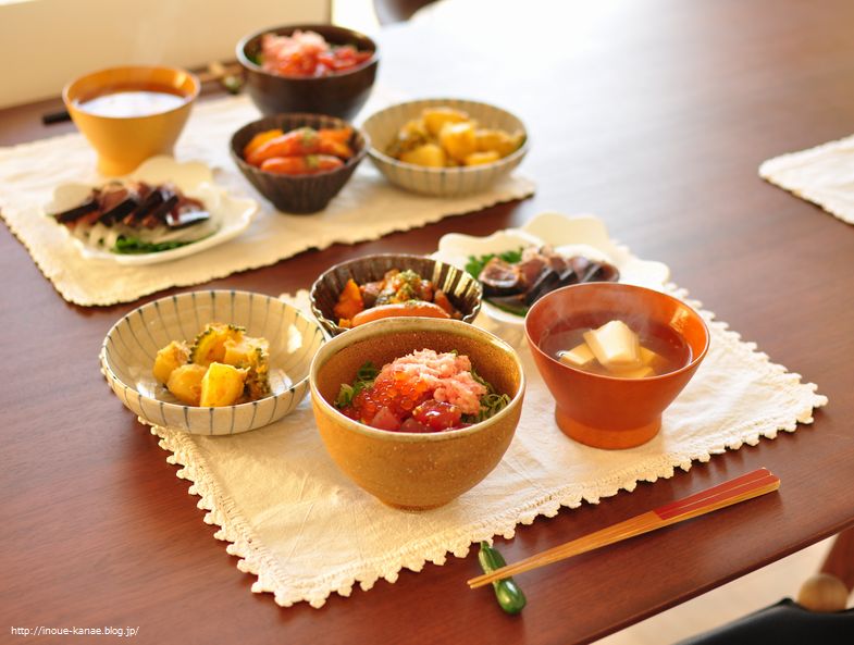 なーさんが晩ごはん要らないというので、彼女のそんなに好きではない(唯一)マグロをメインにした海鮮丼に。