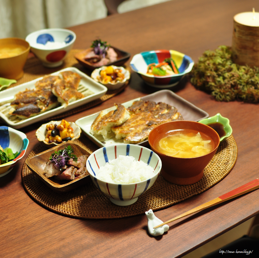 頂いた美味しい餃子をメインに、あとは小松菜の煮びたしやらおまめで適当に作ったおつまみとか、来月の予行演習で焼いたポンドステーキとか。