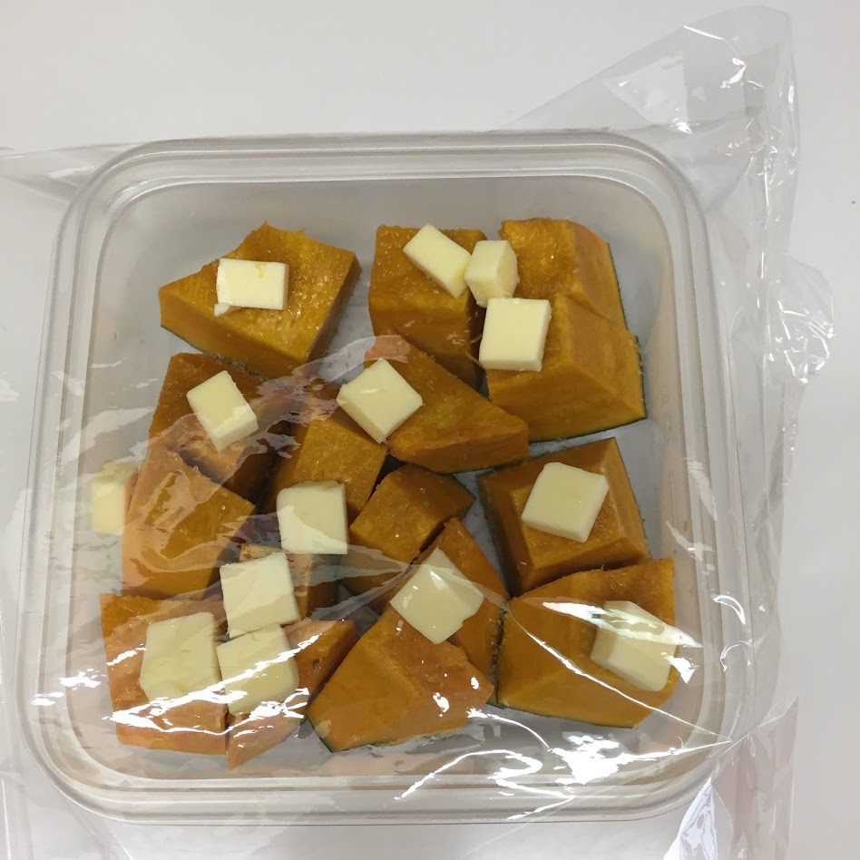 1)耐熱容器に(ここではジップロックのコンテナを使用しています)一口サイズにカットしたカボチャを皮を下にして並べる。塩をまんべんなくふりかけ、バターをのせます。なるべく細かくカットして1個ずつに乗せたほうがいいよ。