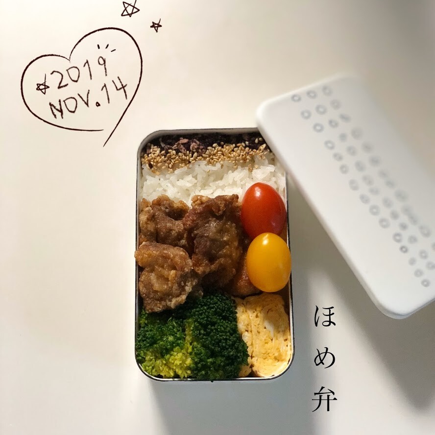 唐揚げ、ブロッコリー、卵焼き、ミニトマト、ごはんって、基本のお弁当みたいな見た目になるよね。