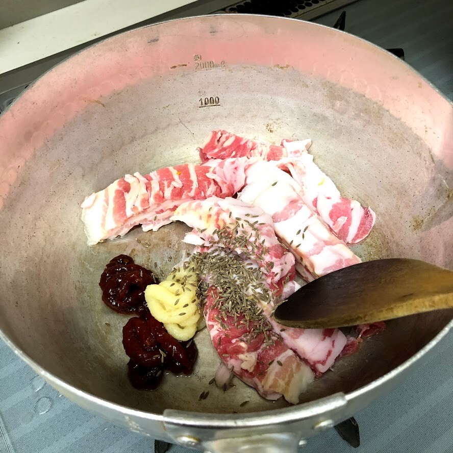 2)鍋に豚肉とAを入れて中火にかけ、肉の色が変わるまで炒める。