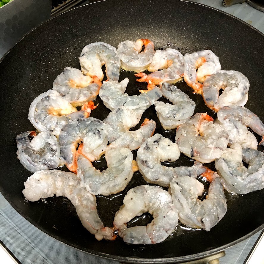 この時も1尾ずつ入れていかないと、どさっと一気に入れてしまいますと、フライパンサイズの巨大なエビの塊になってしまいますのでお気をつけて。