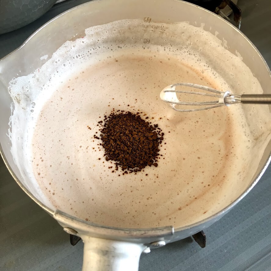 1) 鍋に牛乳を入れて弱火にかける。ふつふつと温まってきたらマシュマロを入れてかき混ぜ、完全に溶けたのを確認して手で割った板チョコとコーヒーも入れて溶かし混ぜる。