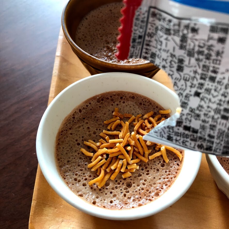 これにチョコを混ぜて作り、仕上げにベビースターをトッピング。カリカリとしたしょっぱいベビースターと、滑らかな甘いチョコムースの組み合わせが癖になる美味しさに!