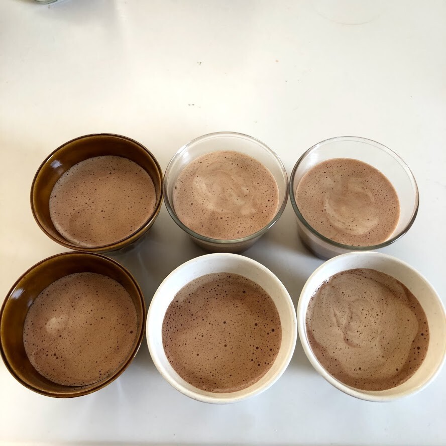 2) 器6つに流しいれ、ラップをして冷蔵庫で3時間ほど冷やし固める。
