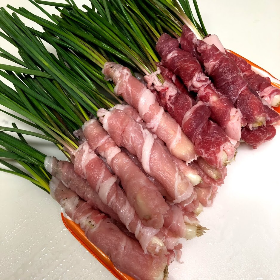 島らっきょに豚肉を巻き付けたところ。