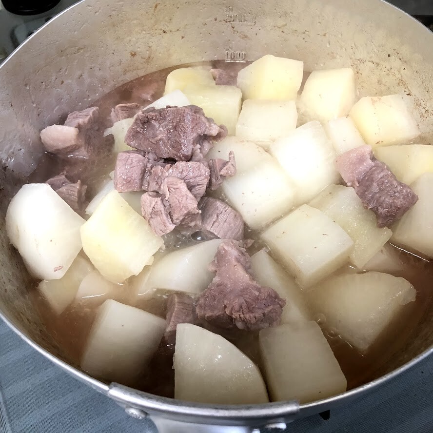 3)大根と肉が柔らかくなってきたら、水分と具に分ける。(水分のほうは冷まして上に浮いてきた脂を取って、スープはお料理に使ってください)
