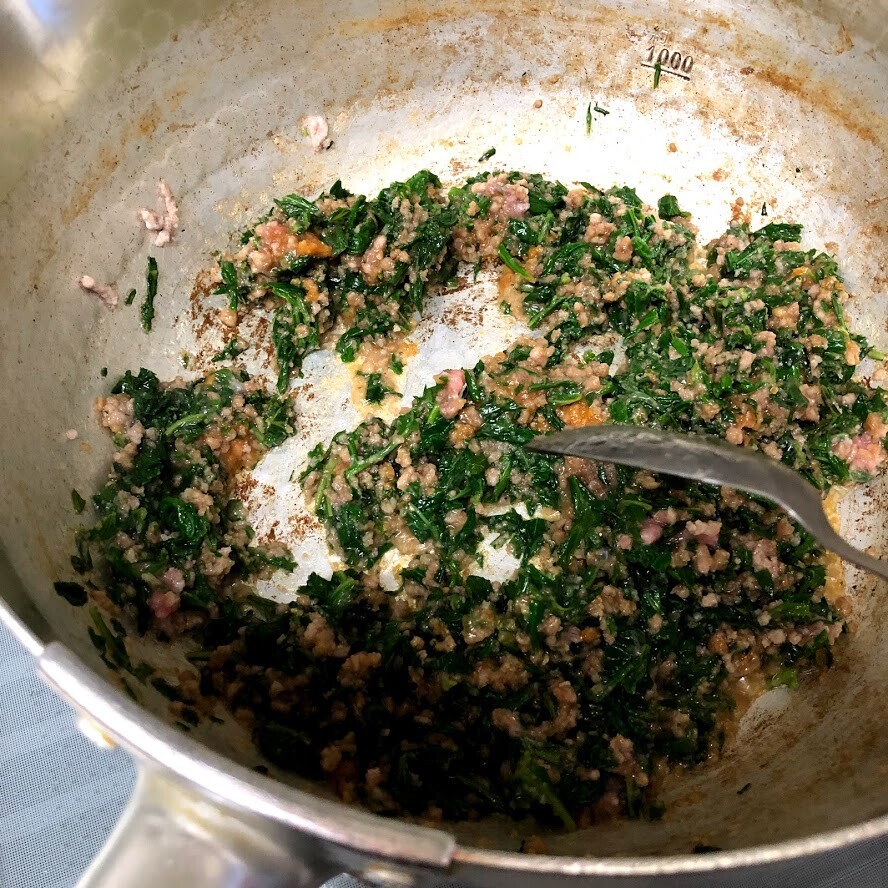 ヨモギを使って、肉みそです。