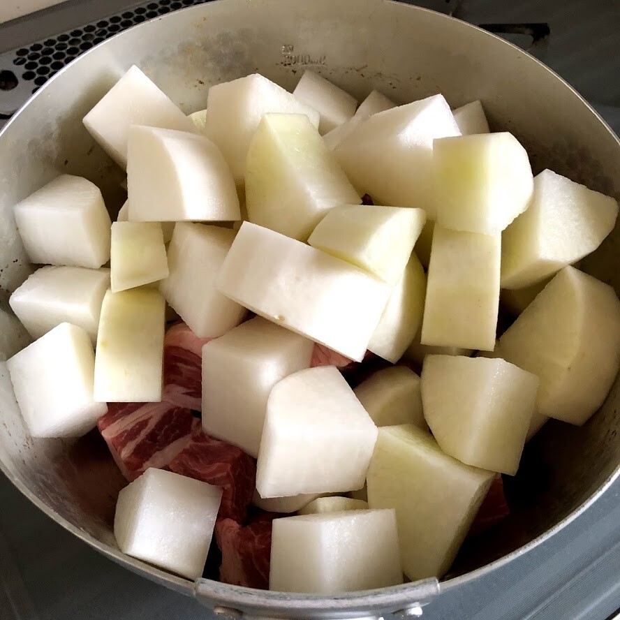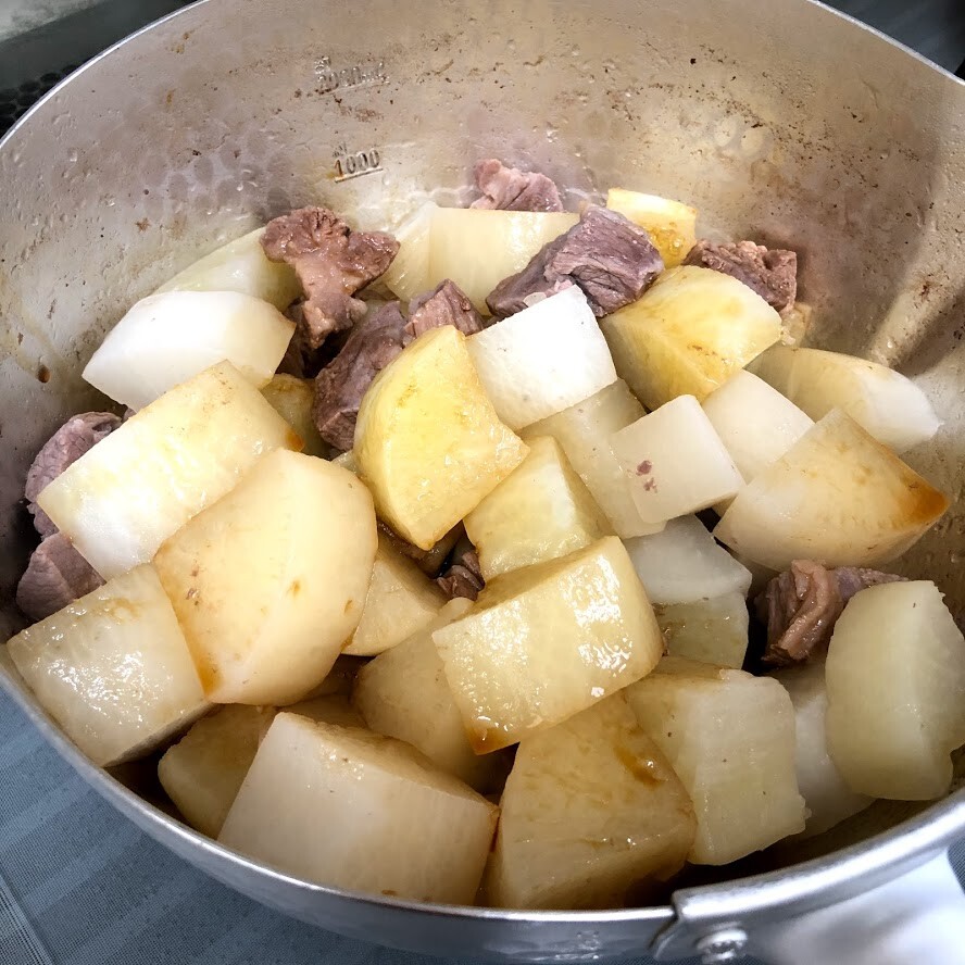 2)鍋に肉を入れ、その上に大根をのせ、水と酒を入れ、蓋をして中火で30分ほど煮る。