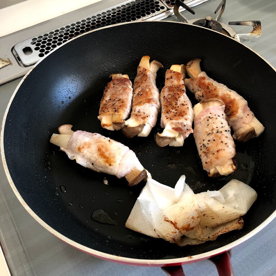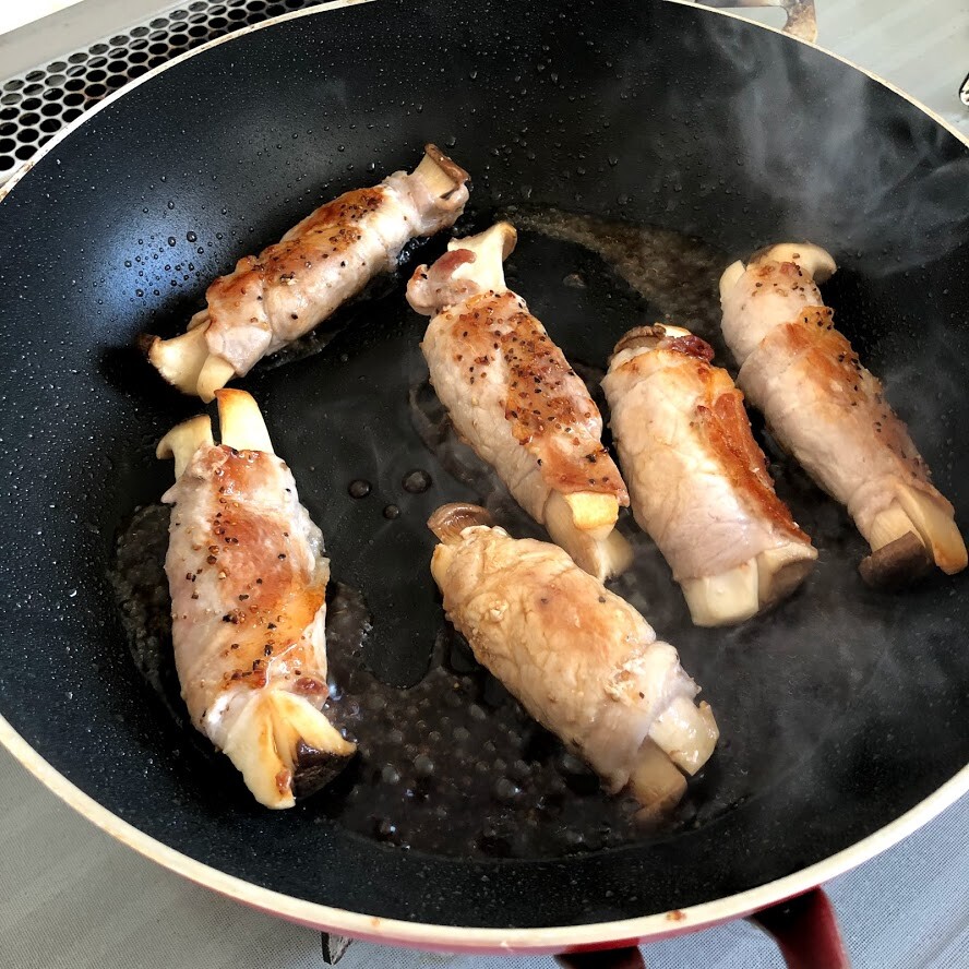 エリンギを豚の薄切り肉で巻いて、塩、コショウを振ってフライパンで焼き、米酢と醤油を煮からめています。