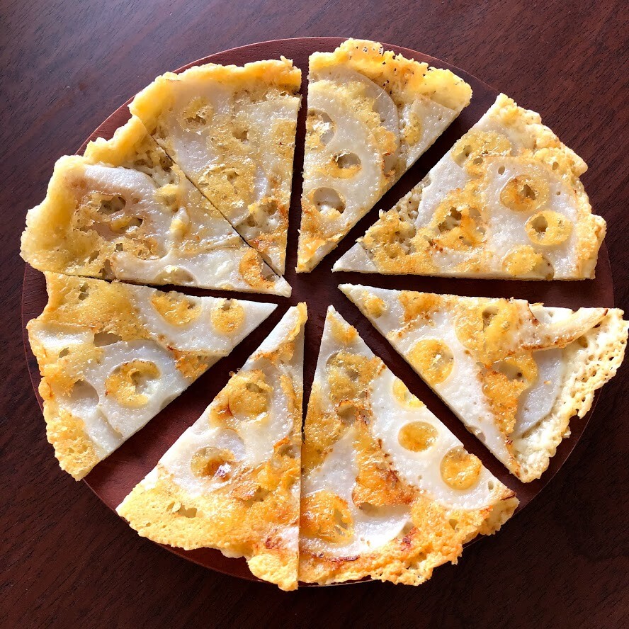 ピザ用チーズを広げてスライスしたレンコンを乗せて焼き、