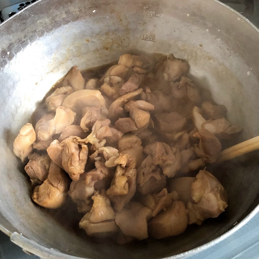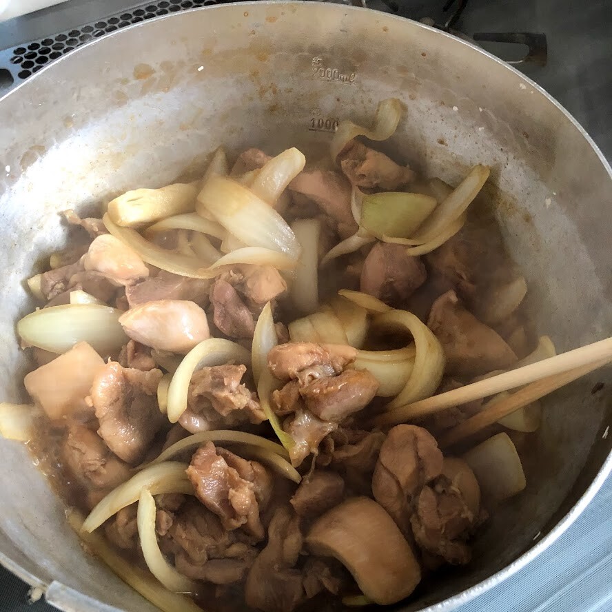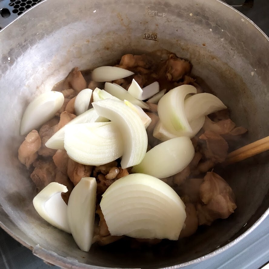 1)玉ねぎはくし形に切る。鶏肉は3センチ角くらいに切って鍋へ入れ、Aも鍋に入れて中火から強火にかける。5分くらい煮たら玉ねぎを入れ、しんなりするまでたまにかき混ぜながら5分ほど煮る。