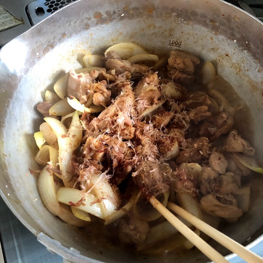 3)1の鍋に鰹節を加えてひと混ぜし、2の卵液を流し入れて10秒くらい待って火を止める。蓋をして蒸らしてもいいし、半熟のまま食べるのもアリ。