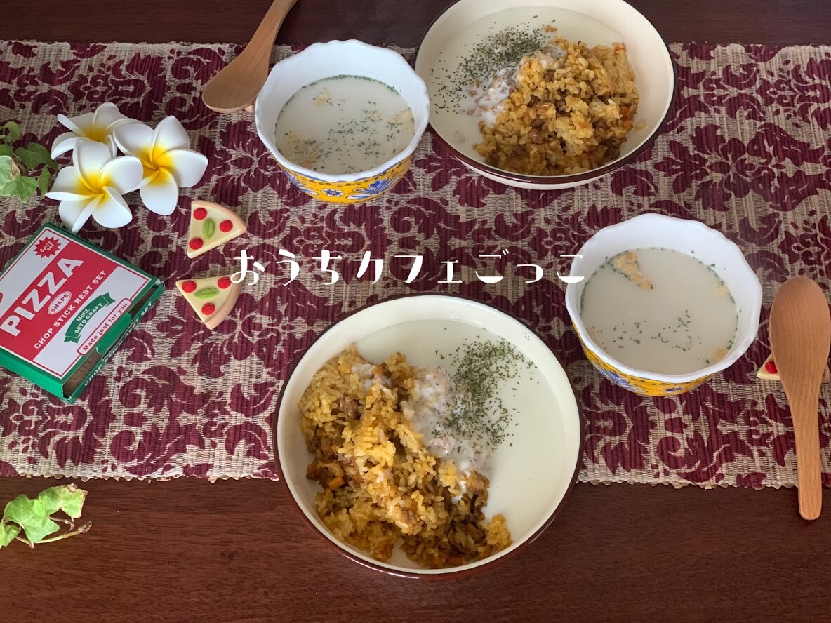 玉ねぎとひき肉、ニンジンをフライパンで炒めて、カレー粉(カレールーでもいいし)、ケチャップ、塩、醤油で味付けしたものを、炊飯器にセットした米の上にのせて炊くだけ。