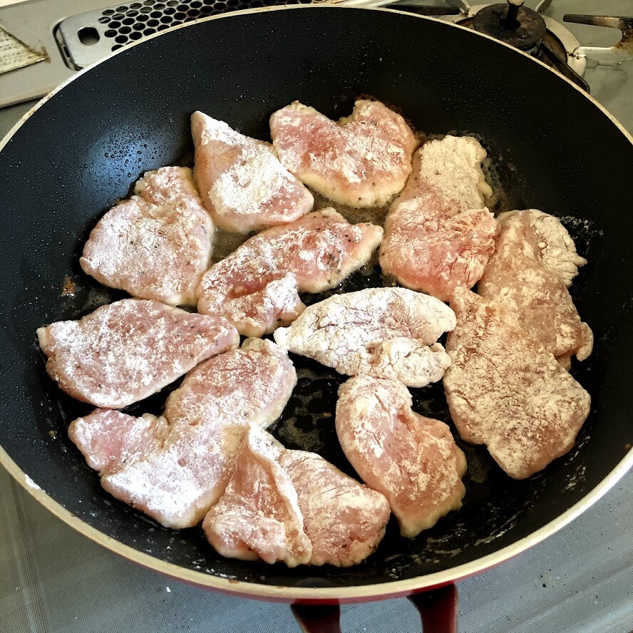 鶏むね肉は削ぎ切りにした後塩コショウして、粉をまぶしてフライパンで焼く。