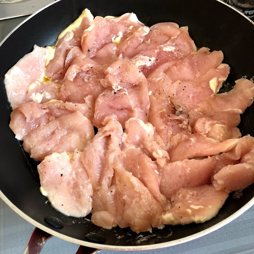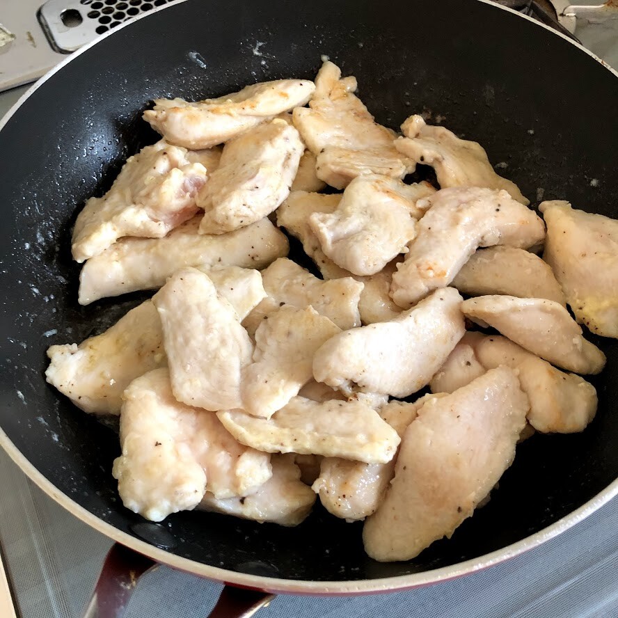 胸肉は削ぎ切りにした後、塩、胡椒、酒、片栗粉を揉みこんでおきます。