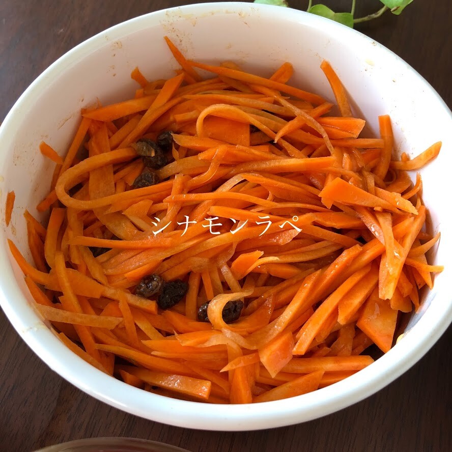 キャロットラペは今日のはシナモンパウダー入り。塩、ハチミツ、米酢、シナモンパウダー、レーズンで和えました。