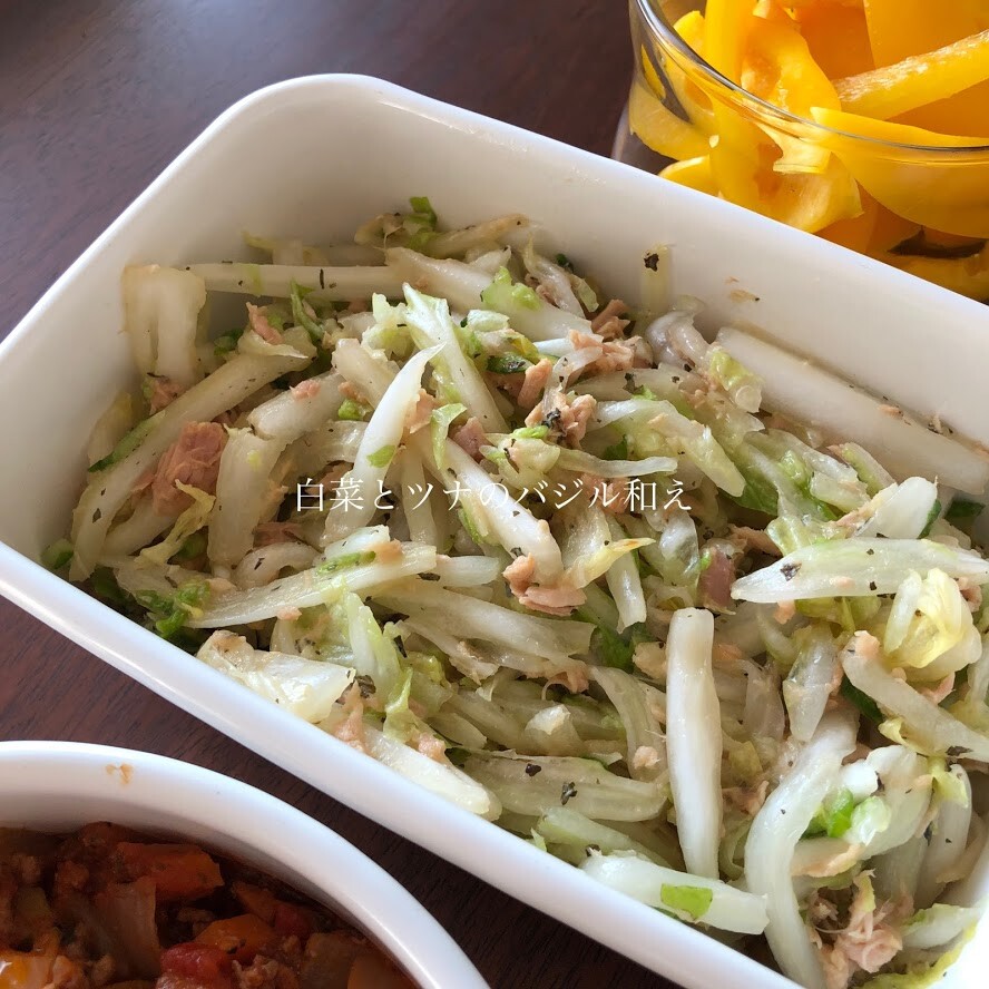 白菜は塩もみして水分を絞り、ツナ缶とバジル、レモン汁、醤油で和えましたが、これきっと日にちが経つと水分出てきてまうから、お醤油は食べる時にその都度かけることにしたら良かったかも。