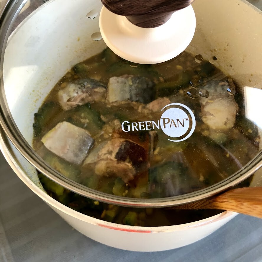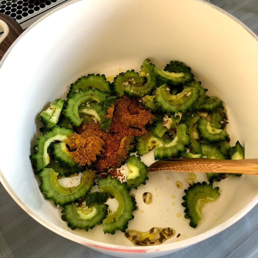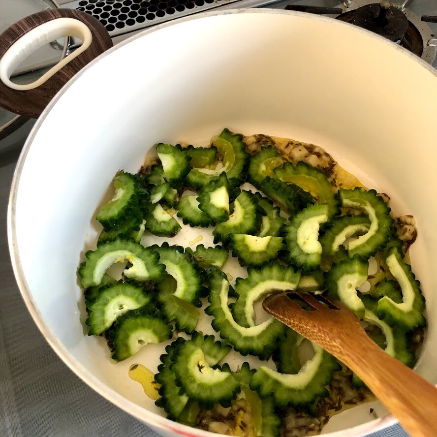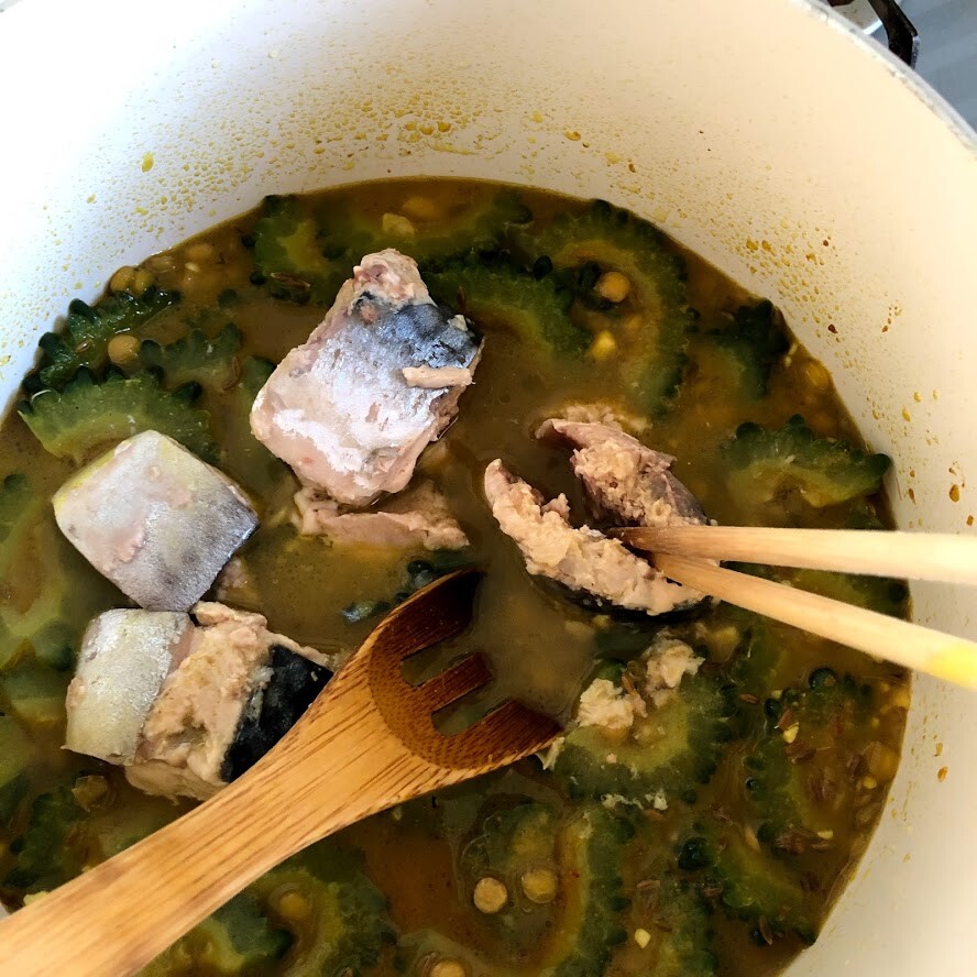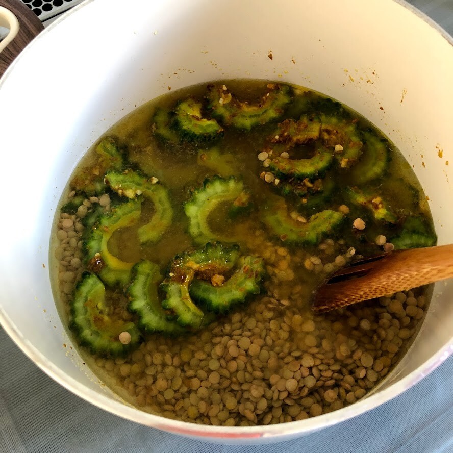 2)鍋にオイルとクミンとニンニク、ショウガを入れて中火にかける。香りが立ってきたらゴーヤを入れて炒める。全体に油が回ったらレンズマメとカレー粉を加えてざっと炒め、水を加える。鯖缶を汁ごと全部加え、蓋を斜めにかけて13~15分ほど中火から弱火で煮る。