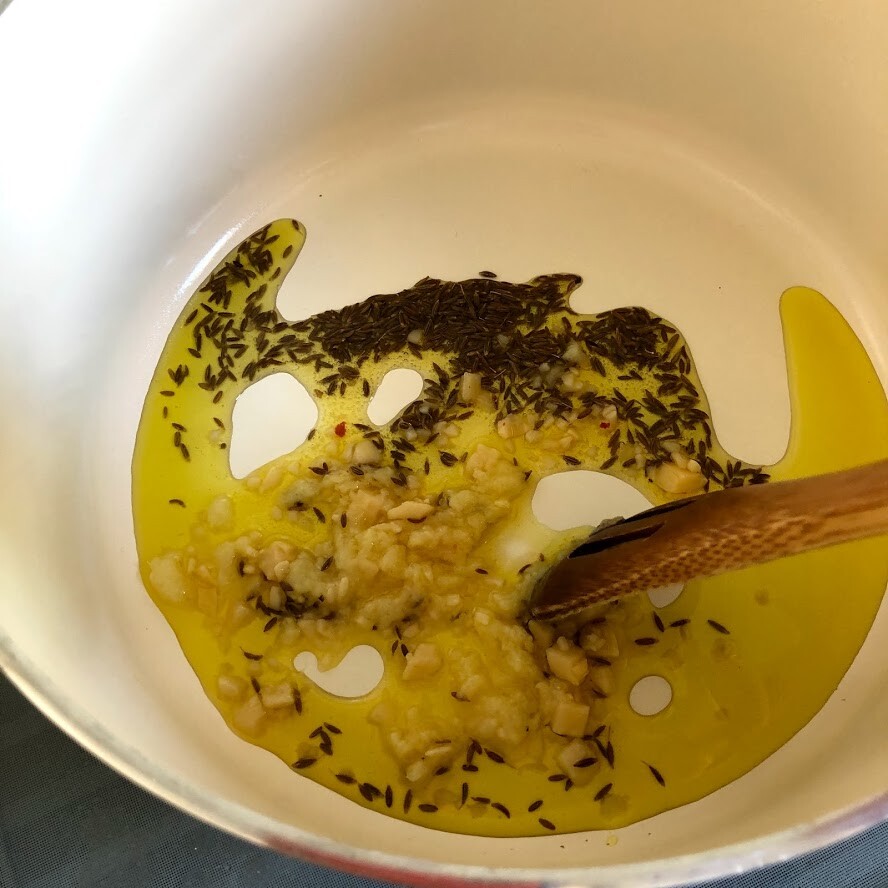鍋にオイルとクミン、ニンニク、ショウガを入れて温める。