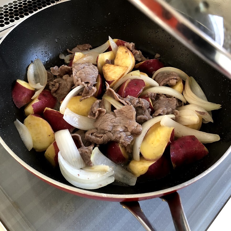 2)フライパンにサラダ油をひき、水気をきったサツマイモを広げて入れる。その上に玉ねぎを散らし、牛肉を広げてのせ、分量の塩をまぶす。蓋をして中火にかけ、10分加熱する。5分経ったところで一度かき混ぜる。