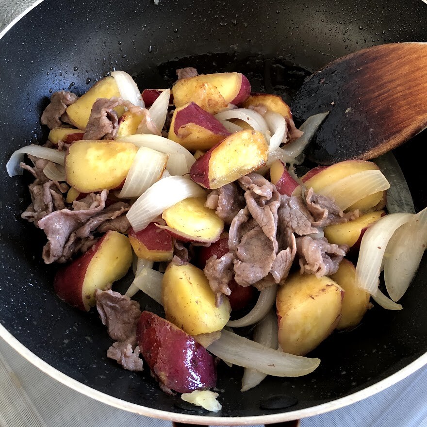 サラダ油→サツマイモ→玉ねぎ→牛肉→塩