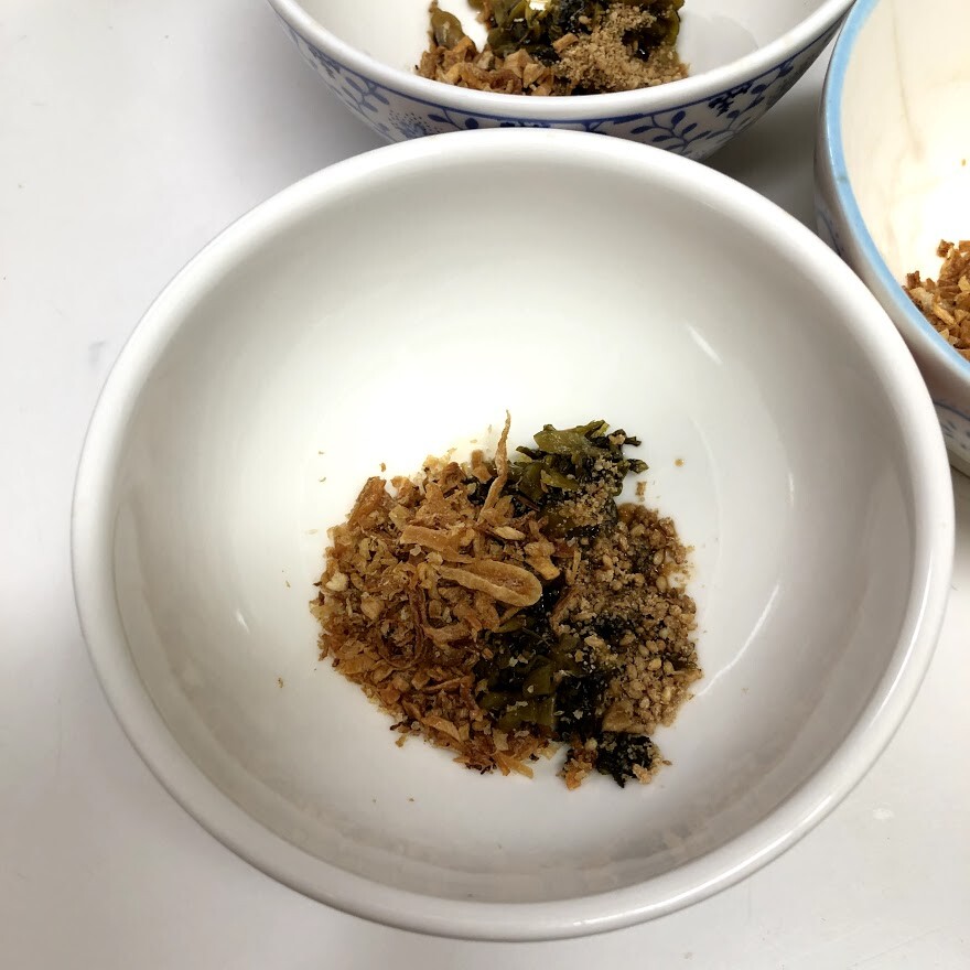 器に高菜漬け、フライドオニオン、すりごま、塩、しょうゆ、ラー油を入れておき、温めた豆乳をそそぐだけです。