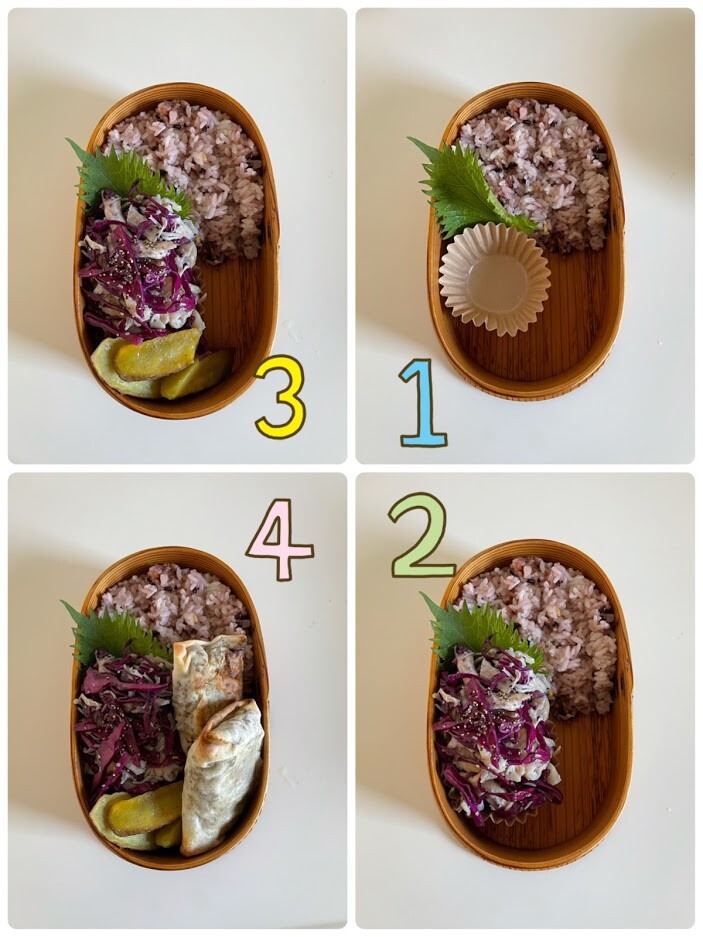 基本は日曜日に副菜野菜系の日持ちおかずを30分以内で作り→メインは当日の朝作ったり前の日の晩ごはんのメインおかずをお取り置きしたものを再加熱して1個のお弁当になっています。