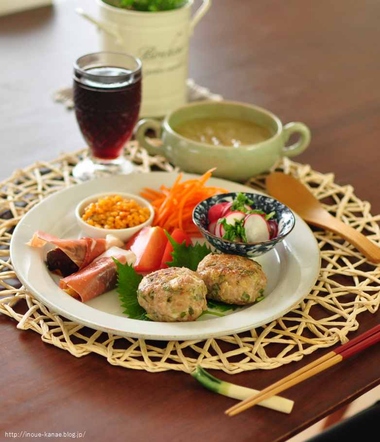 わたしはこのようにいろんなものを盛り合わせて食べましたが(飲みましたが)、オットと息子とすぅさんはセロリバーグメインで普通の定食のように食べてもらってます。