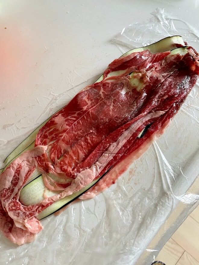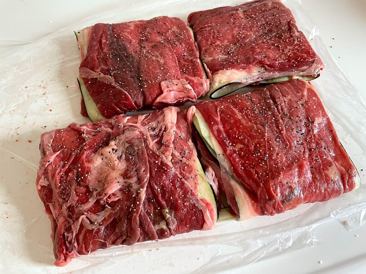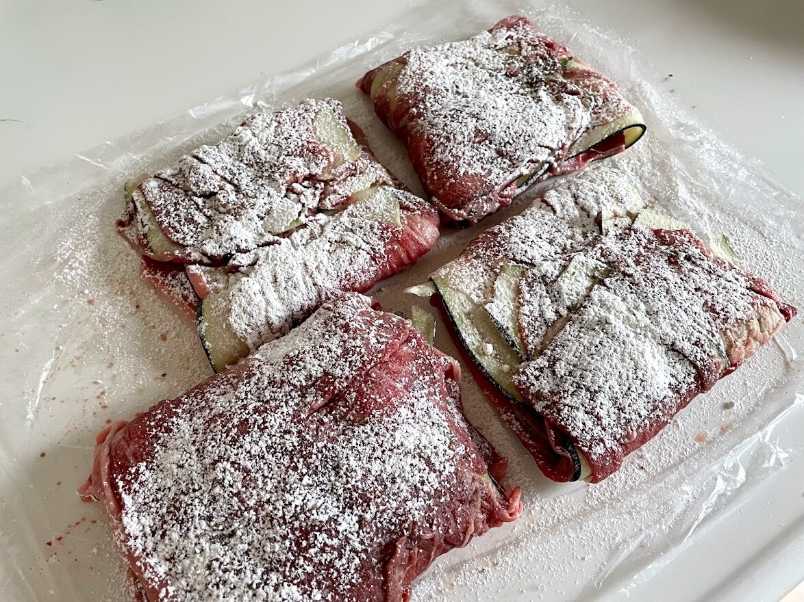 2)牛肉を広げ、ナスを並べる。その上に牛肉をまた広げ、ナス、牛肉の順に重ねる。これを両側からたたんで3つ折りにする。これを4つ作り、表面に塩、ブラックペパーを振って、茶こしで薄力粉をまぶす。