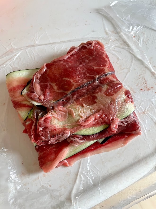 すき焼き用の牛肩ロースの薄切り肉を広げて、ピーラーで薄くそいだナスをのせ、また肉をのせ、ナスをのせ、肉をのせたものを三つ折りにし、これに塩コショウ、薄力粉をまぶしてフライパンで焼き、照り焼きだれを絡めました。