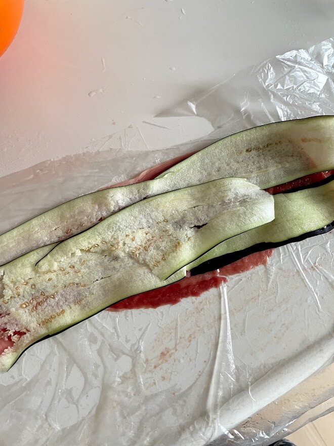 1)ナスはピーラーで薄くそぎ、水につけてあく抜きしてざるにあける。