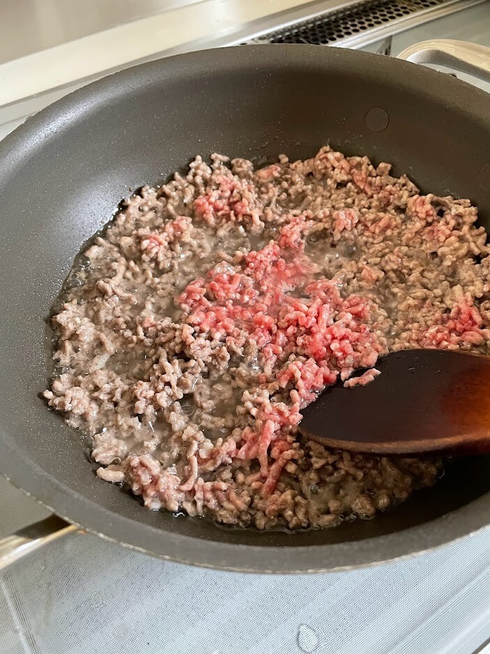 合いびき肉を炒めます。