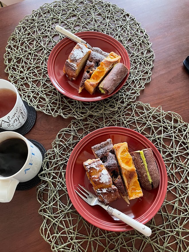 昨日、次女が三宮のパン屋さんで美味しそうなパンを買って帰ってくれてたので、今朝はそれをカットして分けっこして食べたんですね。