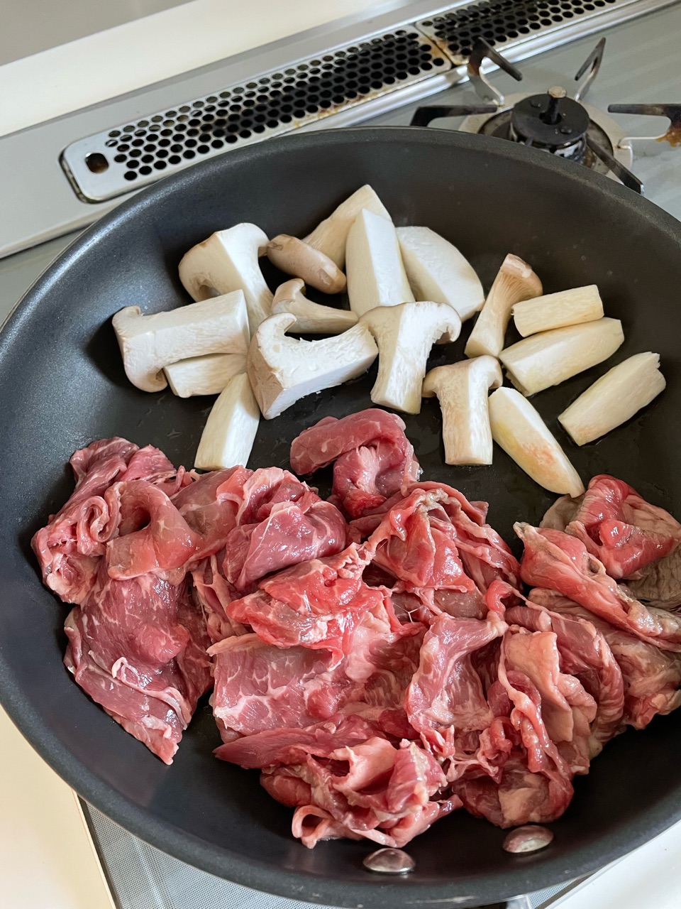 1)エリンギは食べやすい大きさに、牛肉も食べやすく3センチ長さくらいに切る。