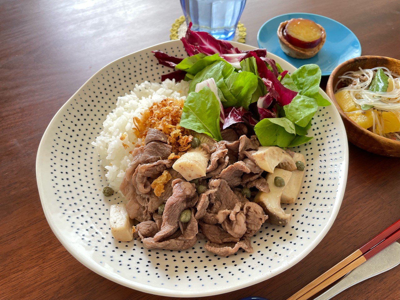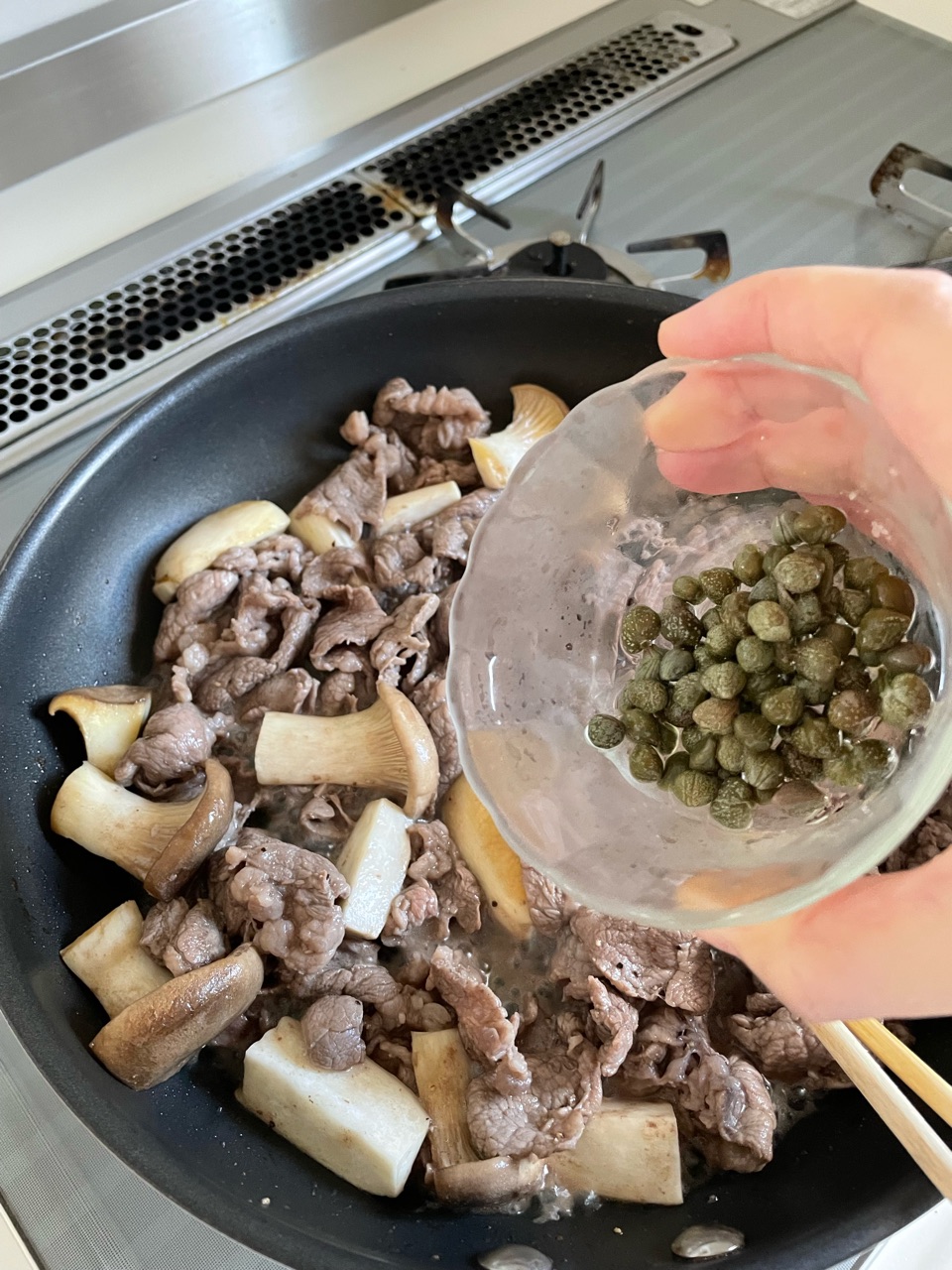 牛肉ときのこを炒めて、シンプルに塩と胡椒で味付けした炒め物に、アクセントになるかなと思いつきで冷蔵庫のケイパーを入れてみたところ、