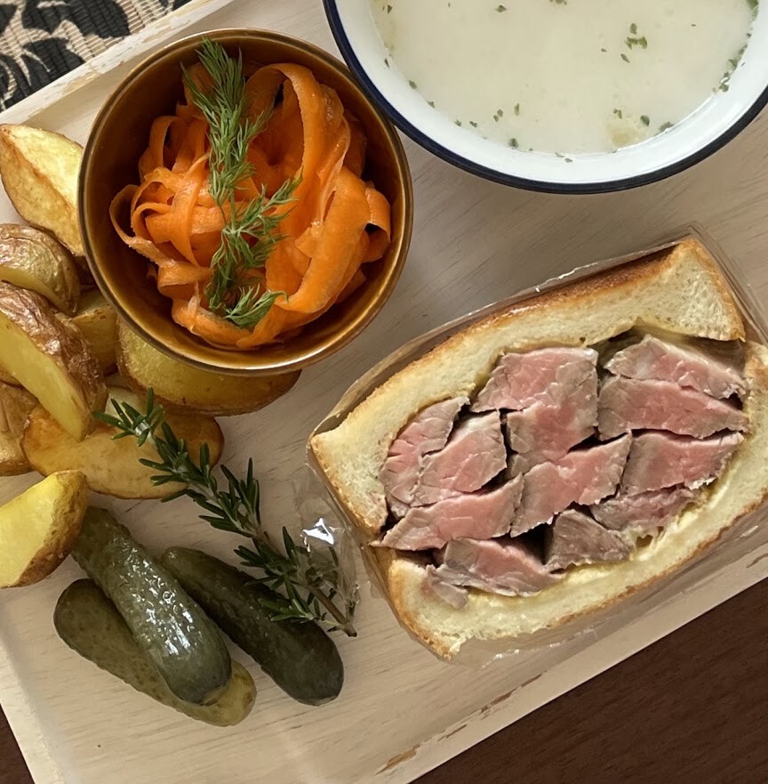 サーロインステーキのサンドイッチに、ピクルス、ひらひら人参サラダ、お湯注ぐだけのスープ、そして焼きポテトで完成です。