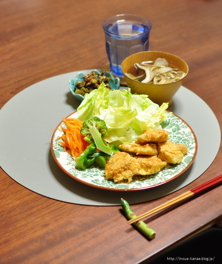 前夜にささみのフライを作っていた時に、残りのささみに下味につけておいたものがあったので、これに衣を絡めて、前夜の残り油で揚げ焼きに。