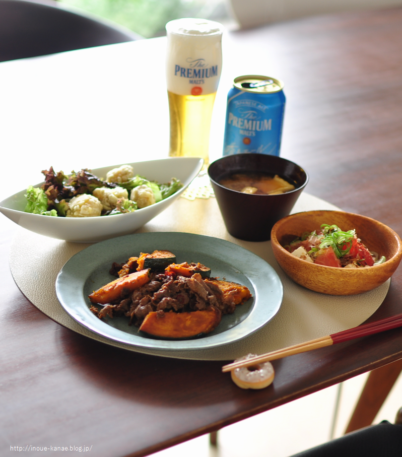 美味しい国産のかぼちゃを使って、夏向けのお肉おかずを作りました。