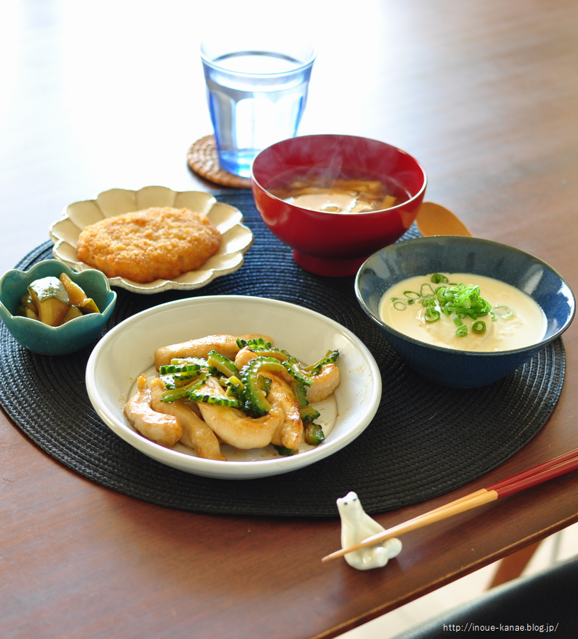 スティック状に切って下味を揉みこんだ鶏むね肉と、ゴーヤを一緒に炒めてオイスターソースでお味付けしました。
