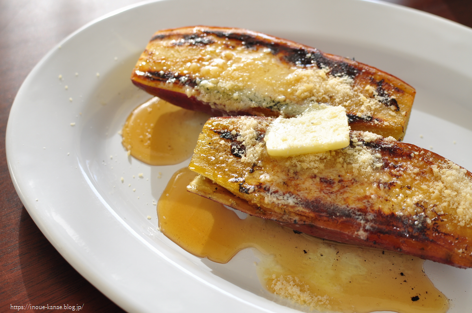 フライパンで蒸し焼きにしたサツマイモに、粉チーズとバターと、そしてラチーニのはちみつをかけるだけ。