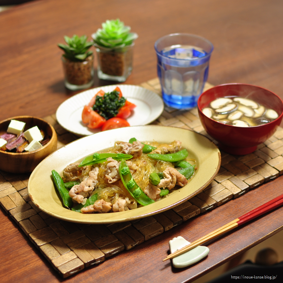 豚コマ×スナップエンドウ×春雨で、シンプルな炒めものです。
