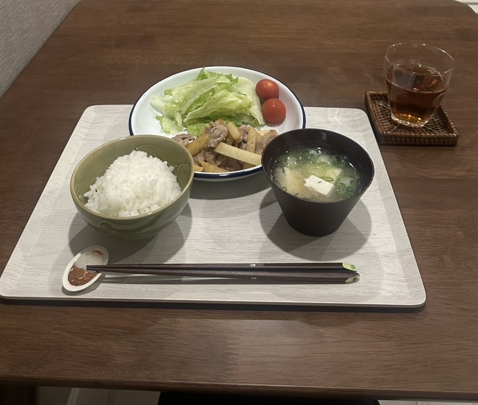 豚ジャガきんぴら、レタス、ミニトマト、ごはん、お豆腐のお味噌汁。