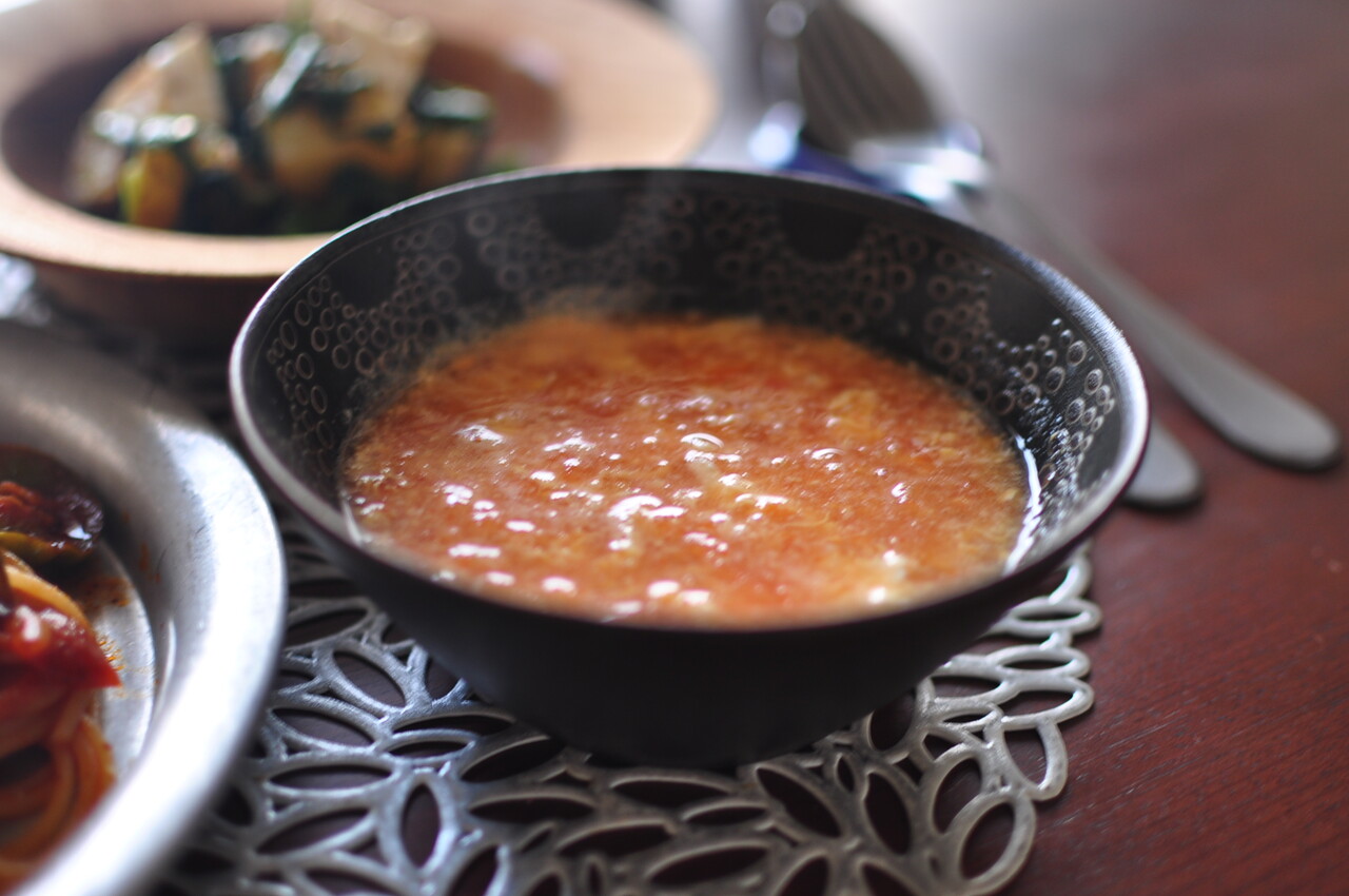 冷凍のトマトをまるごと1個使って作ったスープです。